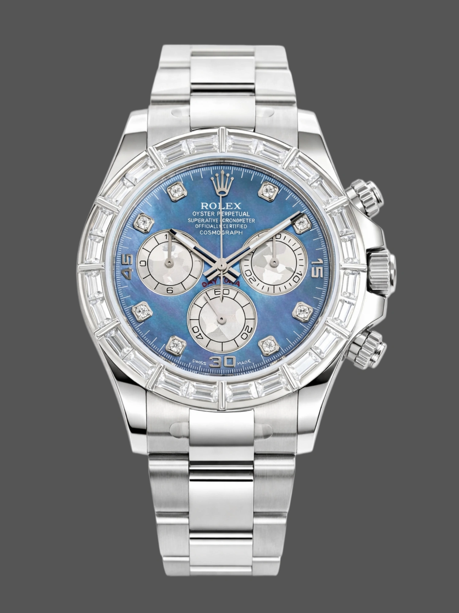 Daytona provides a range of metal choices such, as 18 karat gold in white variants alongside Everose gold. Each blend comprising 750 parts per thousand of pure gold mixed with silver and copper in a proprietary ratio developed through extensive research over the years, at the Rolex foundry facility. Moreover Daytona showcases expertise in jewelry making with its timepieces adorned with gem set bezels and dials.