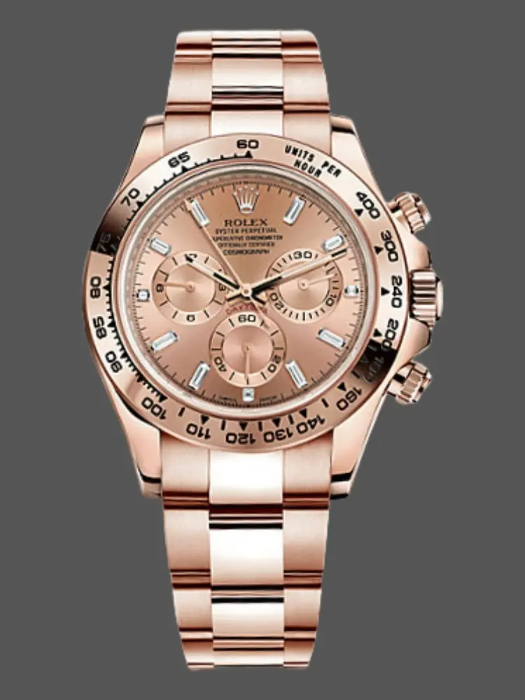 Daytona provides a range of metal choices such, as 18 karat gold in white variants alongside Everose gold. Each blend comprising 750 parts per thousand of pure gold mixed with silver and copper in a proprietary ratio developed through extensive research over the years, at the Rolex foundry facility. Moreover Daytona showcases expertise in jewelry making with its timepieces adorned with gem set bezels and dials.