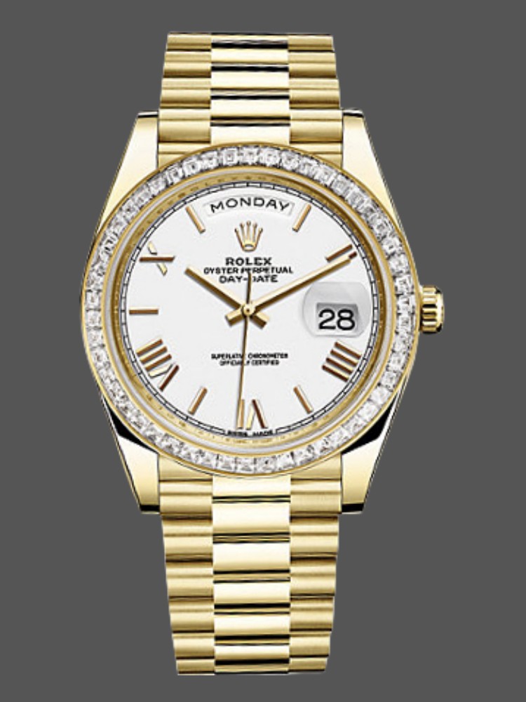 Rolex Day-Date 228349RBR White Roman Dial Diamond Bezel 40mm Mens Replica Watch